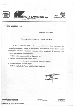 Huta Zawiercie S.A.Zadania przy budowie kotłowni gazowo-olejowej, budowa sprężarkowni dla Walcowni Prętów, udział w budowie linii ciągłego odlewania stali, udział w budowie Walcowni Prętów, budowa odpylania dla Pieców 1 i 3 |